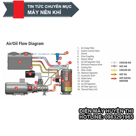 – Van cửa hút máy nén khí – Cụm đầu nén – Van một chiều – Van chặn dầu – Bình chứa dầu và lọc tách dầu – Lọc tách dầu – Đường dẫn dầu và hồi dầu – Van áp suất tối thiểu – Van hằng nhiệt – Lọc dầu – Bộ giải nhiệt khí (after cooler) |